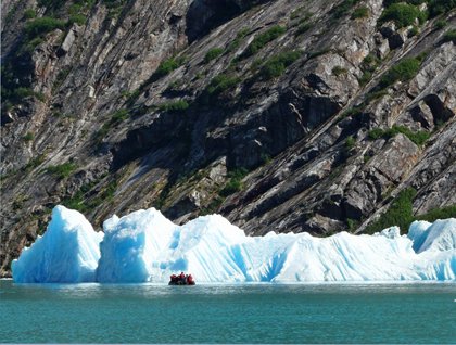 Our day was devoted to exploring Endicott, the southern arm of this spectacular fjord system. We spent the morning cruising up the fjord, along steep stunning canyon-like walls carved by the receding Dawes glacier. The National Geographic Sea Bird wended her way through the milky green water filled with various sizes of ice—large icebergs, mid-sized bergie bits, and smaller growlers, so-named for the sound they make as the ship scrapes along their sides. By midday the face of Dawes glacier was in sight, and after lunch we climbed aboard the expedition landing craft to get a closer look at the magnificence displayed around us. Snow-covered mountains gave way to waterfalls, droplets flinging themselves down the steep cliff walls down to sea. As we neared the glacier face, a few bits of calving accompanied by the CRACK! sound of white thunder, though nothing to compare to the huge icebergs floating nearby. It’s hard to get a sense of scale here—everything is so large! The air is sweet and pure and rich here, and I found myself going into a meditative nourishing deep rhythmic breathing. To top things off, our hotel manager came around with a hot chocolate boat. Yum!