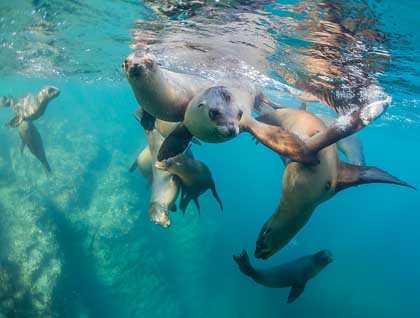 We awoke after a very pleasant calm night anchored in Ensenada Grande. Before breakfast we weighed anchor and headed north to Los Islotes. These islets are small and isolated enough to be a favorite spot for marine mammals and birds. After breakfast we hopped into rubber boats for a close look at them. We found brown boobies staring at us from the cliffs, and blue-footed boobies perched in higher spots. Pelicans crowded broken craggy slopes and yellow-footed gulls stalked the tideline. But best of all were the sea lions. About 150 sea lions live here throughout the year, their ranks doubled during the breeding season. We saw them sprawled over the rocks like piles of dirty laundry, abandoned to relaxation. While sea lions love company, and often use each other as pillows or cushions, they seem to take umbrage at being jostled. Their annoyance, though rarely very serious, is always loudly expressed.