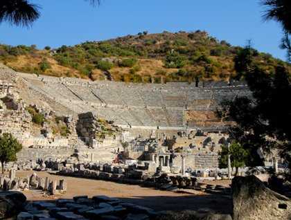 Our visit to the site started at the Civic Agora in front of the Odeon or Bouleuterion—a small covered theater where the City Council made up of the city’s wealthiest citizens met and where they listened to musical concerts. We continued our tour walking down the Royal Walk between the columns of the Stoa of Basileios towards the monument of Memmius, which marks the division between the upper and lower halves of the city. Once through the monumental Gate of Hercules, we started to walk down Kuretes (Priests) Street that ends in the square in front of the Library of Celsus. In Antiquity, this was the heart of the city, flanked on each side by purple-marble colonnaded stoas (porticos) that were punctuated by shops, the Fountain of Trajan, and a Temple dedicated to Emperor Hadrian. After taking a side tour through the Roman Bath and the latrines, we crossed back over Kuretes Street and into a huge modern structure that covers six interconnected homes of the “Rich and Roman” that were built into the side of Mt. Bülbül. Oh—to be “Rich and Roman!” Peristyle houses with marble-columned courtyards, variegated marble veneered walls, mosaic floors, frescoed halls, running water, and interior plumbing. After taking our photos of the Library, we passed through the main Agora before having a quick look at massive theater that in its day held 25,000 spectators.
