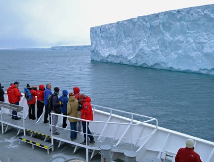 After dinner we continued to towards the Austfonna icecap on the island of Nordaustland. Cruising alongside the glacial face of Bråsvellbreen we spotted a bearded seal hauled out on ice. The Austfonna icecap stretches for over 100 miles and combined with the ice from Vestfonna the ice covers 80% of the island, making it the third largest icecap in the world. In the area we visited the sheer cliffs of the ice shelf rose 70 feet above the water and 35 feet below. Because the ice is sheer and the sea floor is quite deep in that area, the ship’s guests were able to see the pale blues, thin sedimentary layers, and crystalline angles up close at what seemed like touching distance.