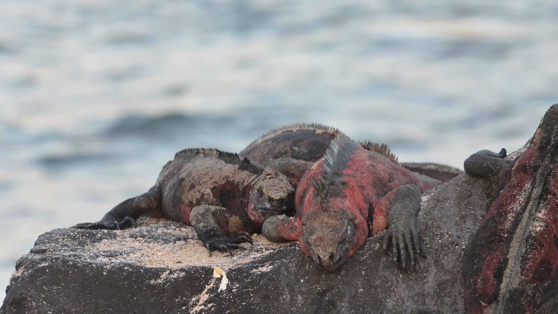 In the afternoon, we set foot on Punta Suarez, a paradise for observing seabirds. As we walked along the trail, we spotted Christmas iguanas, one of the seven subspecies of marine iguanas that exist in the archipelago, and one of the most colorful ones too. We then observed several waved albatrosses in flight. As we walked up the trail, we saw a few waved albatrosses, attempting to mate with the females that had just landed. And we spotted several nests and chicks of the Nazca booby, one of the three species of boobies that breed in the Galápagos.