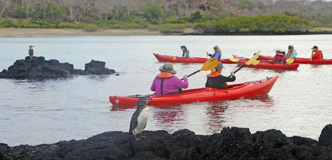 We woke up early in the morning as National Geographic Islander navigated along the northern part of Isabela Island. Slowly the sun appeared above the clouds surrounding Volcano Wolf. We spotted our first birds as Galapagos fur seals returned to shore from their night hunt. We enjoyed a great breakfast. Afterward, expedition leader Vanessa called everyone to the bow to celebrate as we crossed the equator. Our guests happily crossed the line. Approaching Punta Vicente Roca, the visitor site, we spotted Galapagos sea lions and a good number of ocean sunfish. The first activity of the day took place as we dropped anchor at Punta Vicente Roca. This is a spectacular geological site. The combination of the former volcano’s tall cliffs and the tuff cones formed later adds an amazing contrast to this unique visitor site. Our best tools for exploration, our Zodiacs, were lowered down, and off we went to explore the coast. We observed Nazca boobies and blue-footed boobies resting on the small ledges of the tuff cones. Galapagos sea lions swam close to our Zodiac, and Galapagos penguins rested on a broken piece of the tuff cone after feeding. What a wonderful sight! In a calm area, we found a good number of Pacific green sea turtles. The morning’s activities ended with snorkeling. Pacific green sea turtles, plenty of colorful fish, Galapagos marine iguanas and flightless cormorants surrounded us. It was a phenomenal experience! The ship was repositioned toward Fernandina Island. The youngest island of the archipelago, Fernandina is a highlight of our expedition. This island shows our guests the beginning of life. We observed animals thriving in the hostile environment. Pioneer plants like lava cacti grow on the lava fields, breaking down rocks little by little to create soil for the next generation of plants. Punta Espinoza is known for its huge colony of Galapagos marine iguanas. It is hard to distinguish the iguanas from rocks since they are so dark in color. On the other hand, colorful Sally Lightfoot crabs added contrast to the young, dark lava fields. We ended our walk as the sun was setting, returning to the ship with great memories. It was a fantastic day in the western part of the archipelago.