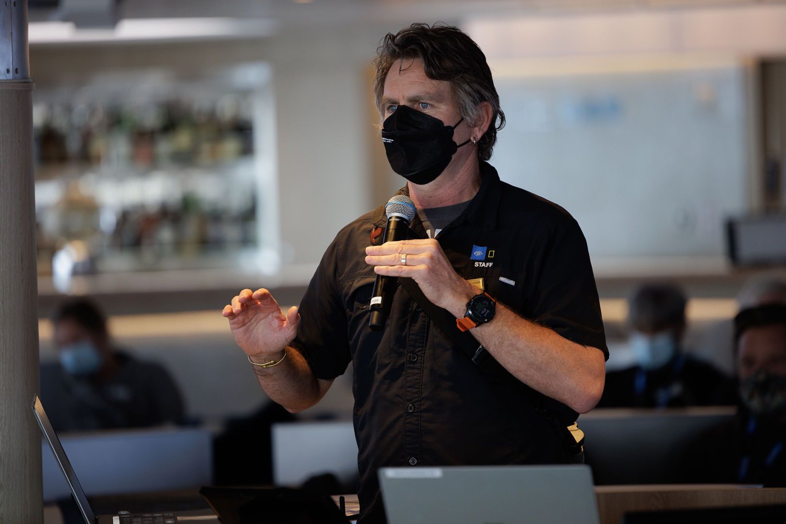 On National Geographic Endeavour II today, we explored Bartolome, home of a small colony of Galapagos penguins. Bartolome is one of the youngest islands, and it is located next to Santiago Island in the central part of the archipelago. After an amazing sunrise, we went ashore for a walk, and we were transported back to a time when the land was newly formed. We began our day by hiking to the top of a tuff cone known as the islet of Bartolome, named after the First Officer of The Beagle . Walking on this young island allowed us to understand the formation and volcanism of the Galapagos Islands. The rocks are a great way to understand the area and its geology. We spotted a few lava lizards and painted locusts, some of the very few animals on this island. As we reached the top, we had a great view. Our guests enjoyed the magnificence of Pinnacle Rock. After we visited one of the most iconic geological formations of the Galapagos, our breakfast was enhanced by dramatic views of the impressive volcanic landscape. We visited the beach near Pinnacle Rock, where we enjoyed how the sun made the sand sparkle due to a concentration of silica. Later, we went snorkeling along the channel between Santiago and Bartolome Islands. Many of our guests spotted whitetip reef sharks and very colorful parrotfish. The landscape was beautiful with lots of sea stars. We enjoyed the chance to be surrounded by Galapagos penguins and feel accepted as part of this environment. After a delicious Mexican lunch, we had lectures on the photography of reptiles and Darwin. Afterwards, we went to Chinese Hat Islet to snorkel from the Zodiacs. The area is home to a small colony of Galapagos penguins. In a sandy-bottomed, sheltered channel, our guests enjoyed swimming with whitetip reef sharks, rays, and many fish. It was a nice and sunny afternoon. After snorkeling, we had the chance to explore the unique, small volcano that formed an island in front of Santiago on a sunset Zodiac ride. After a spectacular day full of activities in the field, we returned on board. Every day in the Galapagos is an opportunity to reconnect with the beauty of nature through unbelievable encounters!