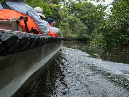Everyone was in awe of our skiff drivers and local guides' ability to spot wildlife as we motored down narrow waterways. All of a sudden, our driver brings the boat to a halt and points to an area in the forest. To us, it is a jumble of leaves and branches, but after a period of coaching we are able to discern a small face peering out of the forest and watching what we are doing. It is a night monkey, very small, dark in color, and looking like everything else in the forest. It was hiding in a small hole high up in the side of a tree. It is the only nocturnal monkey in the world and extremely difficult to find, but somehow, our driver saw, and now we have him in the sights of our binoculars and cameras. A true prize for any naturalist exploring the rain forest.