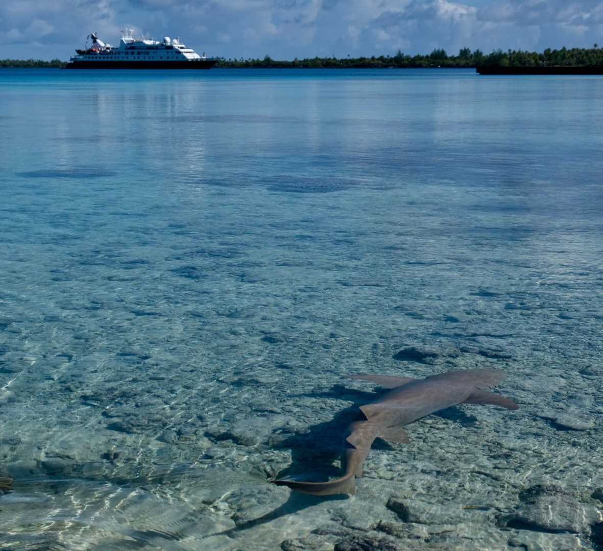Our last day of our expedition took us to Rangiroa, the largest atoll in French Polynesia. Its name can be translated as “Big Sky,” and the name suits this place, as the vast lagoon of this atoll is so sprawling that you can’t see the other end. Guests enjoyed the day visiting a pearl farm. Black pearls are one of the main industries on French Polynesia, and at the farm, we could see how they use surgical precision to insert the mother of pearl bead in the black lipped oysters to produce these pearls. This island has become a center for the pearl farming industry in French Polynesia, as it is the only one with a school dedicated to the teaching of this trade and the research of the species on which it depends. We also enjoyed the lagoon’s gorgeous waters, where we set our snorkeling platform and enjoyed big numbers of fish in a coral garden. Enjoying the pristine conditions of this lagoon, our guests snorkeled among hundreds of snappers, big moray eels, and sharks. A high point of local color, it was a perfect ending to an incredible expedition in French Polynesia.