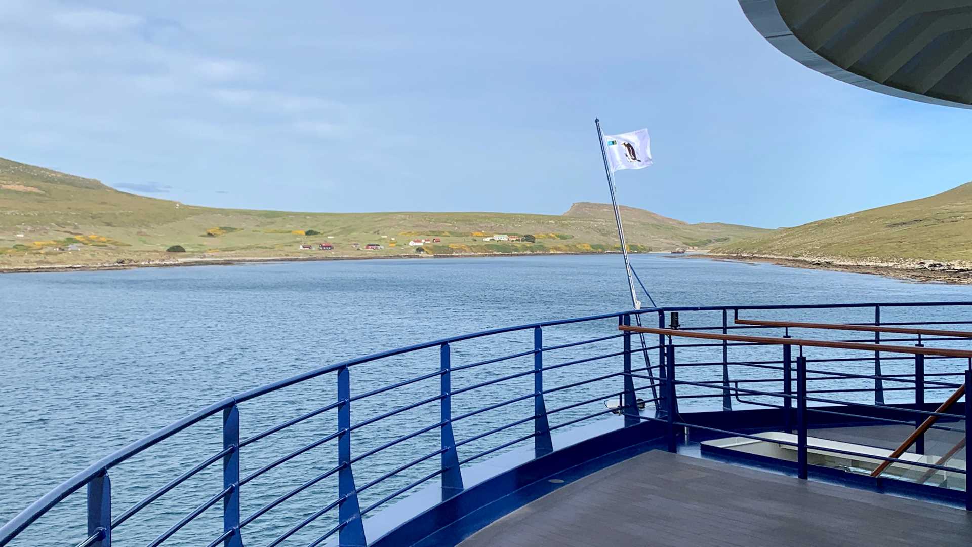 It is difficult to believe we’re on our last expedition landing day. Overnight we were peacefully anchored in Ship Cove and woke up to another fine morning. Even after such an active, eventful voyage, there was still an atmosphere of enthusiasm to seize this final day ashore. Disembarking near the New Island Settlement, we went on a walk through short grass to the tussock atop mixed cliffside colonies of black-browed albatross, rockhopper penguins, and imperial shags. After returning for a quick lunch on board, some of us opted for a long hike along the northern spine of the island to a small sandy beach on the northwest side. The rest of us rode the National Geographic Endurance around the island to meet our comrades on the beach or on the hillsides above the cove.