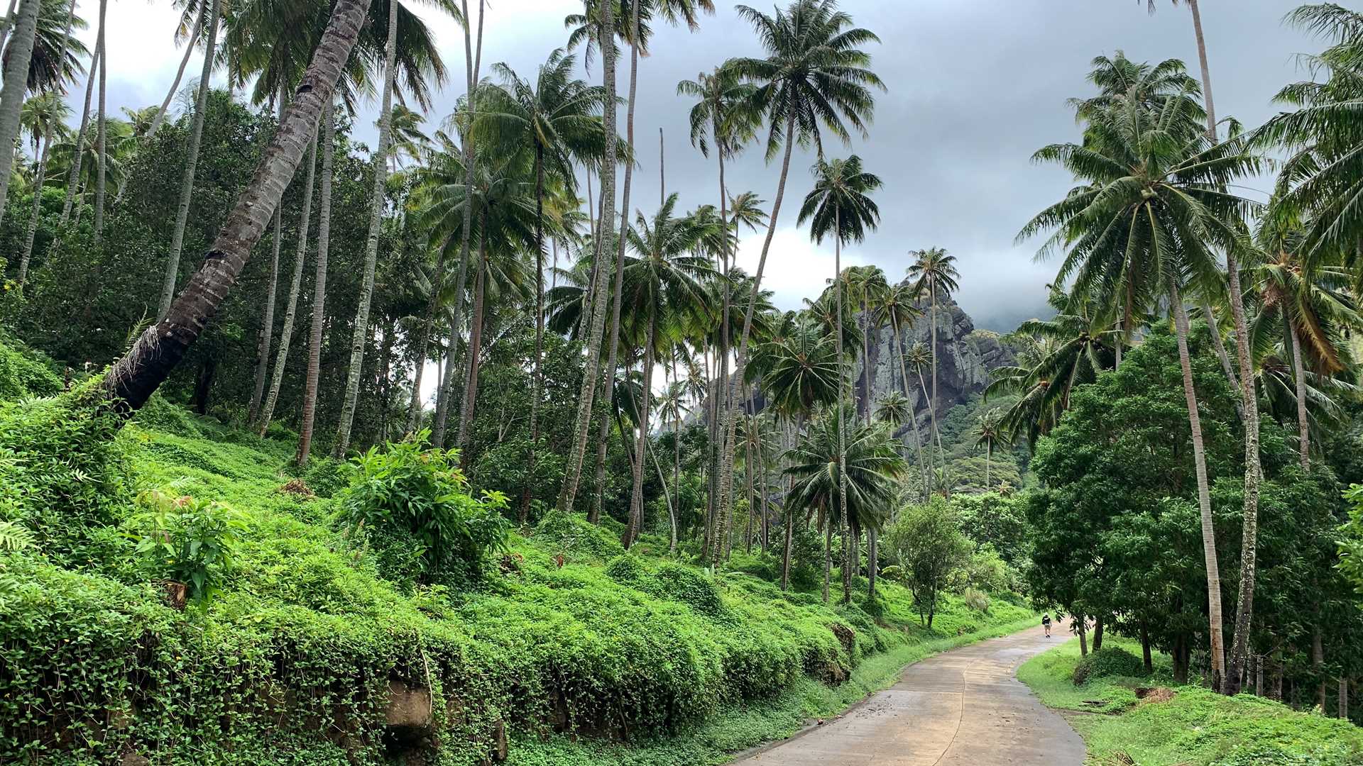 It would be hard to overstate the beauty of Hanavave. The valley opening, where we arrived from the sea, is a maze of rock towers, flowering plants, and coconut palms. The main road through town follows the contours of rock, sometimes next to vertical cliffs. Then it rises sharply, which opens a fantastic view back across the valley. With topography this extreme, it’s hard to believe that Fatu Hiva has any roads at all.