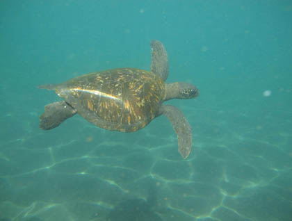 During the walk we see many animals, including big herds of marine iguanas, sea lions, sea turtles, flightless cormorants, a snake, a hawk, and several shore birds. Most of us are surprised at how the abundant wildlife doesn’t seem to notice us. Many interactions are observed, and the three hours spent on this small site feel like only minutes. Isabela Island, with its large shield volcanoes, dominates the horizon.