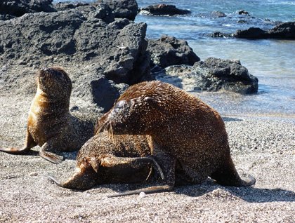 We dropped anchor at Fernandina Island. It was a nice sunny morning with a clear blue sky, and Fernandina Island, the world’s largest pristine island in the world, the youngest of the Archipelago, was awaiting us. Over the innumerable lava flows, which at first sight seems lifeless, we noticed a large number of marine iguanas lying basking in the sun, hugging each other to warm up. These unique animals are found only in the Galapagos, and they are so tame that they ignore us, and we were able to get very close and capture some amazing photographs. It is so hard to see them among the dark rocks that we had to walk very cautiously to avoid stepping on them. This scene was so picturesque, with the colorful sally lightfoot crabs standing out brilliantly against the dark rocks. Not too far away, under the shade of a mangrove tree, a female sea lion was lying with her newborn, the placenta was still at one side, and the cries of the baby sea lion and the tenderness between the mother and her pup was an unforgettable scene to witness. Along the shore, we encountered several playful sea lion pups, which always seem to pose for the cameras. During the walk, we were fortunate to see a pair of flightless cormorants; the male was very busy looking for nesting material, going into the water and coming back with sea weed, while the female cormorant placed the materials in the right position. This is truly an amazing place, and we left with memories that will last forever!