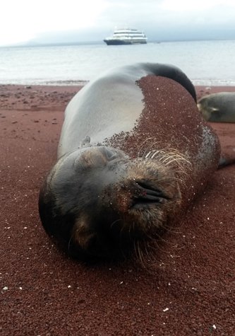 After this walk, we returned to the ship to rest and have lunch while we navigated to the northern region of Isabela Island. This afternoon we went snorkeling, which was amazing—the water was very clear and warm, and we had the opportunity to swim with sea turtles, marine iguanas, penguins, cormorants and more. Some of our guest saw stingrays, and even a Galapagos shark. It was a great experience! Afterwards, we offered a Zodiac ride along the coast of Punta Vicente Roca, where we saw blue-footed boobies, Nazca boobies, Galapagos fur seals, marine iguanas, Galapagos penguins, and brown noddies terns. Later on at sunset, we celebrated the crossing of the Equator line on board our ship, testing some wine and enjoying the brilliant colors of the horizon. What a great finale!
