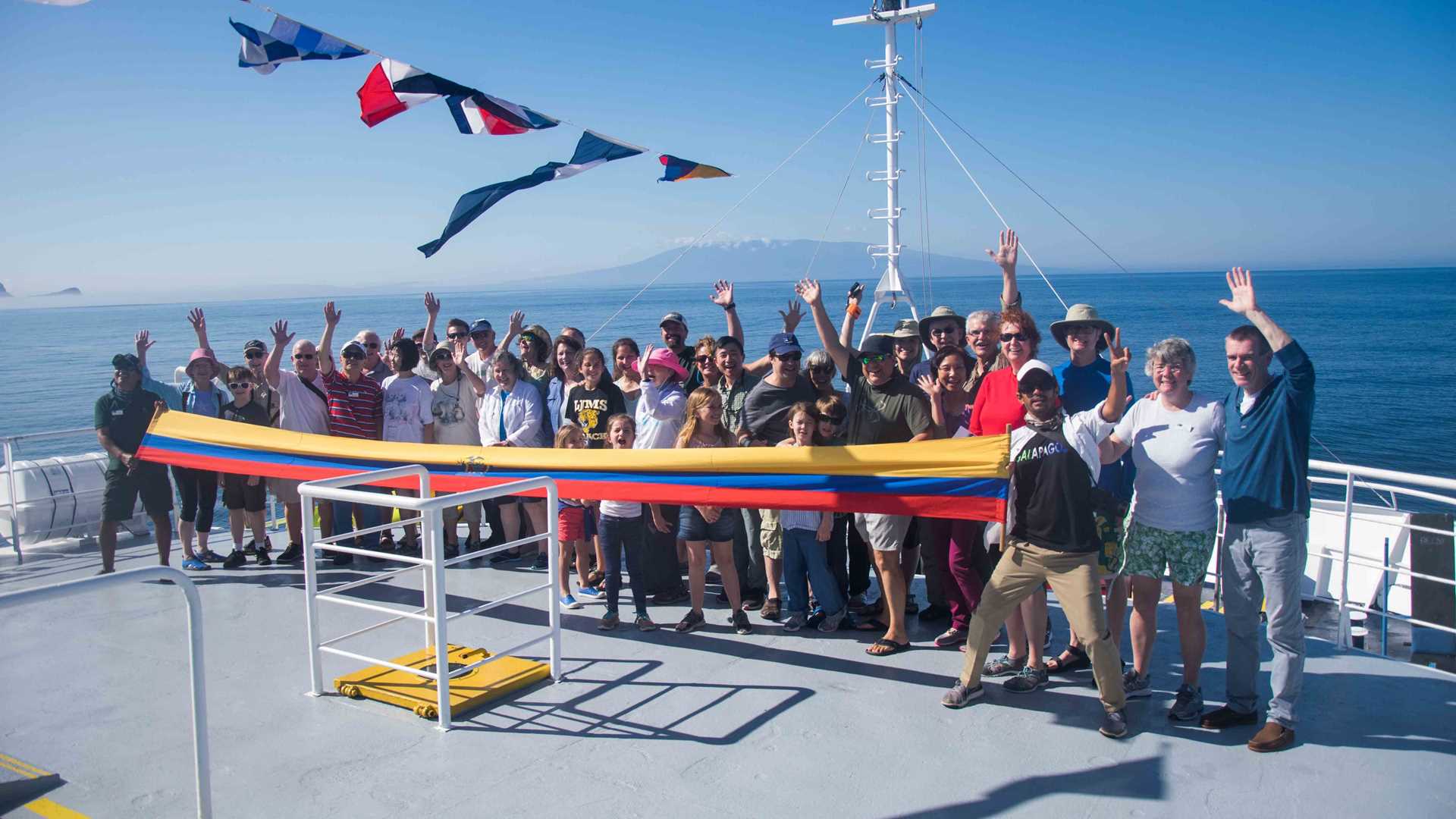 Today we reached the western area of the Galapagos Archipelago, an area that is known for its nutrient-rich waters and the abundance of life that it sustains. Early in the morning we spotted an aggregation of around one hundred common dolphins, a great way of starting our day. After a delicious breakfast, we celebrated a warm ceremony for crossing the Equator line. Later on, we took a zodiac ride along the volcanic landscape of north Isabela Island. The geological features and the great amount of birds and sea lions made this ride really exciting. To end up our morning with another adventure, we snorkeled on Punta Vicente Roca, a great site to spot dozens of green sea turtles swimming around us. After lunch, we worked with our Global Explorers to produce a short movie trailer as part of our educational experiences on board and in the field. In the afternoon, we navigated south to visit Fernandina Island. This island has the greatest number of marine iguanas in the world, and is a fascinating opportunity for wildlife and landscape photography. To end up our day, we enjoyed a wine tasting on upper deck while enjoying an awesome sunset.