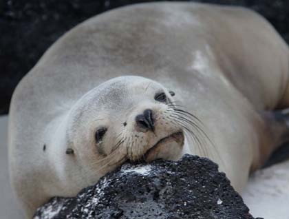 Once we reached the other side of the isthmus, we enjoyed a magical view of white combined with black lava rocks and orange Sally Lightfoot crabs. As soon as we came back onboard the National Geographic Endeavour, we started navigating to our next destination: Champion Islet. Home to seabirds, the islet is also a fish sanctuary. Champion is one of the iconic snorkeling places in the Islands. A delightful Zodiac ride along the coastal zone of Champion Islet was the best way to begin exploration. Once we started exploring the coast of the islet, Galápagos sea lions playfully bit the edges of the Zodiacs. As soon as we reached the cliff area, we enjoyed the presence of many seabirds that found the cliffs to be a perfect nesting spot. At the end of the activity, we finally had the opportunity of sighting one of the rarest birds of the Galápagos: the Floreana mockingbird. Next, we got ready for deepwater snorkeling. As we came into the water, the marvels of the Galápagos Marine Reserve were revealed to us: colorful reef fishes of different species were swimming all over the place and white-tipped reef sharks swam from rock to rock, but the most emblematic of all were definitely the Galápagos sea lions that showed us their swimming skills as they came very close to us.