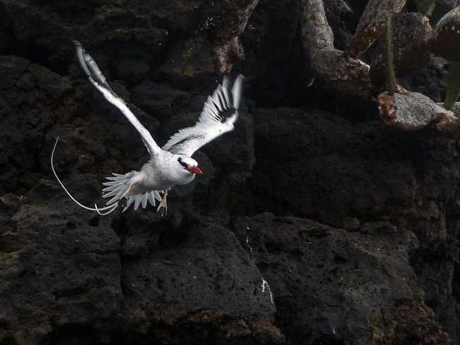 Between breakfast and lunch the National Geographic Islander repositioned and anchored next to a delightful small, low off-shore islet known as Champion (named after a British whaling firm from the 1800’s). Here we tootled around the islet looking for our third species of mockingbird. We had a list to keep up! First day, Chatham mockingbird, second day Hood mockingbird, and now for our Charles mockingbird! I could use the Spanish names as well, but thought to stick with tradition, as the English names were the first to be given during the map-making era by pirates and buccaneers of European descent. Finally a Floreana mockingbird was spotted – at a distance, but it counts for our wildlife list! Other sea birds were more easily found: red-billed tropicbird coming out of its cliff-side nest, blue-footed boobies and Nazca boobies perched atop the bluff, and Galapagos shearwaters squeaking like rubber bathtub toys as they zoomed in flocks around and around, skimming the cliff-front in coordinated maneuvers.