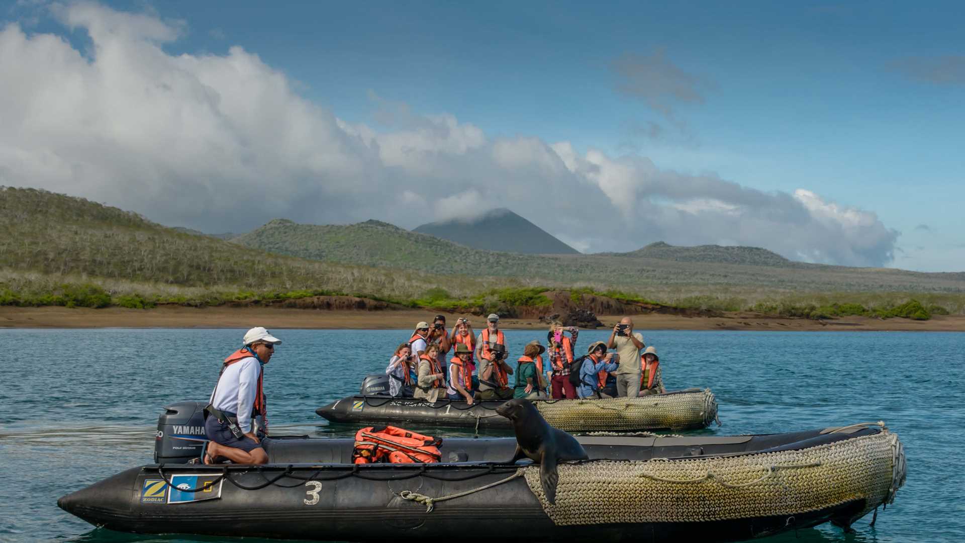We woke up early in the morning as National Geographic Islander navigated along the northern part of Isabela Island. Slowly the sun appeared above the clouds surrounding Volcano Wolf. We spotted our first birds as Galapagos fur seals returned to shore from their night hunt. We enjoyed a great breakfast. Afterward, expedition leader Vanessa called everyone to the bow to celebrate as we crossed the equator. Our guests happily crossed the line. Approaching Punta Vicente Roca, the visitor site, we spotted Galapagos sea lions and a good number of ocean sunfish. The first activity of the day took place as we dropped anchor at Punta Vicente Roca. This is a spectacular geological site. The combination of the former volcano’s tall cliffs and the tuff cones formed later adds an amazing contrast to this unique visitor site. Our best tools for exploration, our Zodiacs, were lowered down, and off we went to explore the coast. We observed Nazca boobies and blue-footed boobies resting on the small ledges of the tuff cones. Galapagos sea lions swam close to our Zodiac, and Galapagos penguins rested on a broken piece of the tuff cone after feeding. What a wonderful sight! In a calm area, we found a good number of Pacific green sea turtles. The morning’s activities ended with snorkeling. Pacific green sea turtles, plenty of colorful fish, Galapagos marine iguanas and flightless cormorants surrounded us. It was a phenomenal experience! The ship was repositioned toward Fernandina Island. The youngest island of the archipelago, Fernandina is a highlight of our expedition. This island shows our guests the beginning of life. We observed animals thriving in the hostile environment. Pioneer plants like lava cacti grow on the lava fields, breaking down rocks little by little to create soil for the next generation of plants. Punta Espinoza is known for its huge colony of Galapagos marine iguanas. It is hard to distinguish the iguanas from rocks since they are so dark in color. On the other hand, colorful Sally Lightfoot crabs added contrast to the young, dark lava fields. We ended our walk as the sun was setting, returning to the ship with great memories. It was a fantastic day in the western part of the archipelago.
