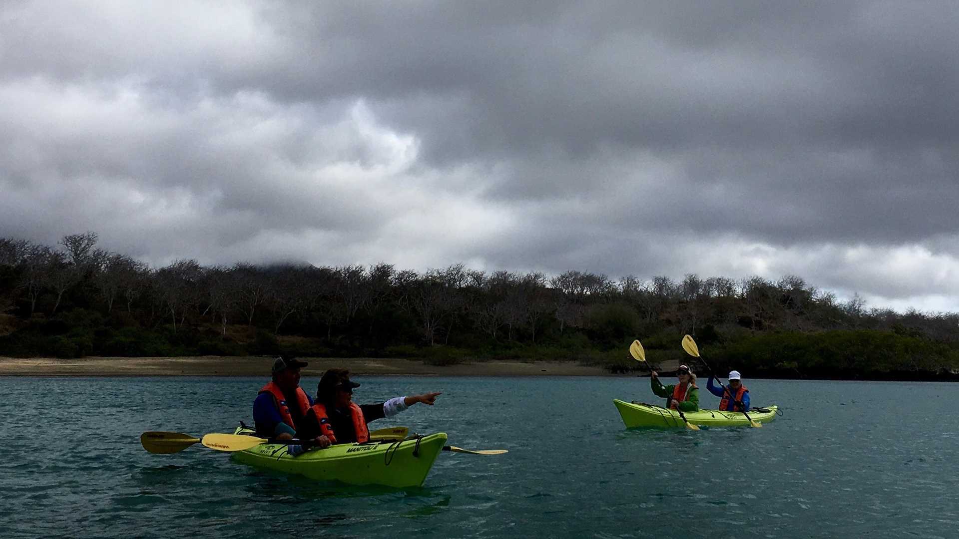 We woke up early in the morning as National Geographic Islander navigated along the northern part of Isabela Island. Slowly the sun appeared above the clouds surrounding Volcano Wolf. We spotted our first birds as Galapagos fur seals returned to shore from their night hunt. We enjoyed a great breakfast. Afterward, expedition leader Vanessa called everyone to the bow to celebrate as we crossed the equator. Our guests happily crossed the line. Approaching Punta Vicente Roca, the visitor site, we spotted Galapagos sea lions and a good number of ocean sunfish. The first activity of the day took place as we dropped anchor at Punta Vicente Roca. This is a spectacular geological site. The combination of the former volcano’s tall cliffs and the tuff cones formed later adds an amazing contrast to this unique visitor site. Our best tools for exploration, our Zodiacs, were lowered down, and off we went to explore the coast. We observed Nazca boobies and blue-footed boobies resting on the small ledges of the tuff cones. Galapagos sea lions swam close to our Zodiac, and Galapagos penguins rested on a broken piece of the tuff cone after feeding. What a wonderful sight! In a calm area, we found a good number of Pacific green sea turtles. The morning’s activities ended with snorkeling. Pacific green sea turtles, plenty of colorful fish, Galapagos marine iguanas and flightless cormorants surrounded us. It was a phenomenal experience! The ship was repositioned toward Fernandina Island. The youngest island of the archipelago, Fernandina is a highlight of our expedition. This island shows our guests the beginning of life. We observed animals thriving in the hostile environment. Pioneer plants like lava cacti grow on the lava fields, breaking down rocks little by little to create soil for the next generation of plants. Punta Espinoza is known for its huge colony of Galapagos marine iguanas. It is hard to distinguish the iguanas from rocks since they are so dark in color. On the other hand, colorful Sally Lightfoot crabs added contrast to the young, dark lava fields. We ended our walk as the sun was setting, returning to the ship with great memories. It was a fantastic day in the western part of the archipelago.