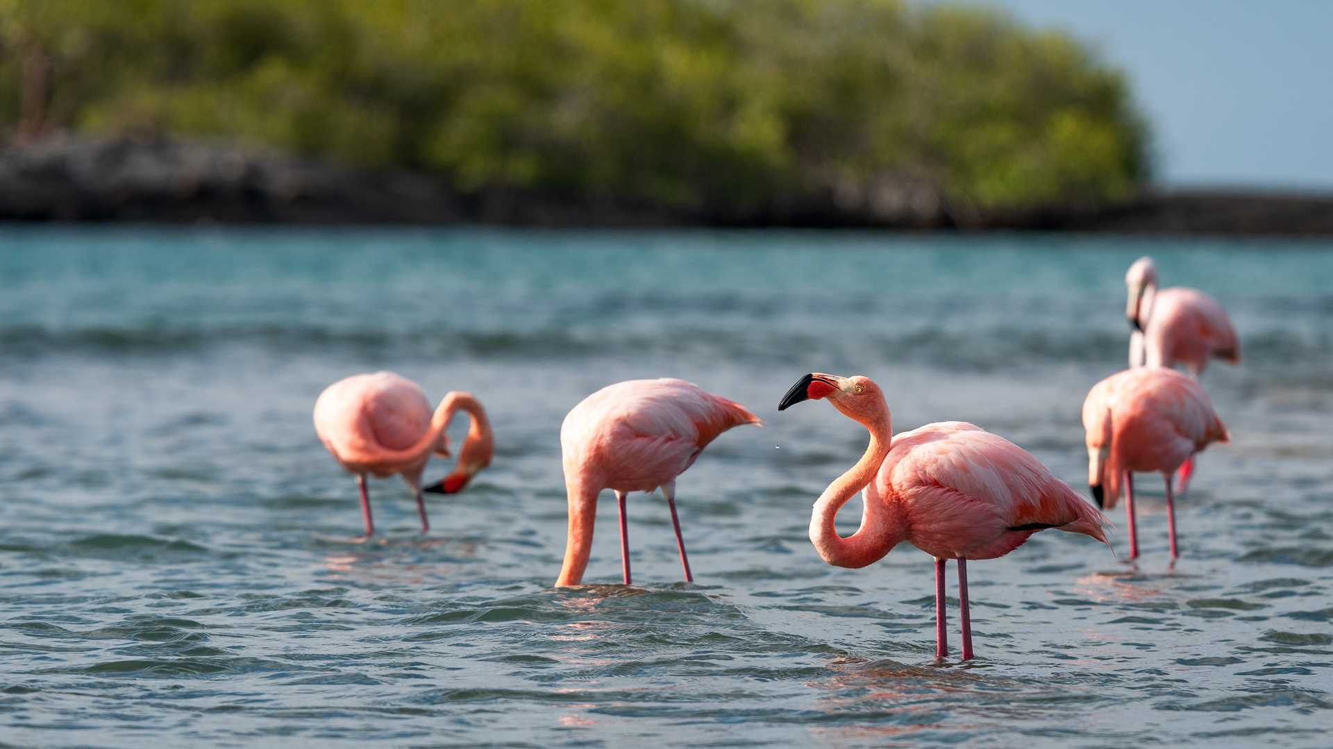 We woke up early in the morning as National Geographic Islander navigated along the northern part of Isabela Island. Slowly the sun appeared above the clouds surrounding Volcano Wolf. We spotted our first birds as Galapagos fur seals returned to shore from their night hunt. We enjoyed a great breakfast. Afterward, expedition leader Vanessa called everyone to the bow to celebrate as we crossed the equator. Our guests happily crossed the line. Approaching Punta Vicente Roca, the visitor site, we spotted Galapagos sea lions and a good number of ocean sunfish. The first activity of the day took place as we dropped anchor at Punta Vicente Roca. This is a spectacular geological site. The combination of the former volcano’s tall cliffs and the tuff cones formed later adds an amazing contrast to this unique visitor site. Our best tools for exploration, our Zodiacs, were lowered down, and off we went to explore the coast. We observed Nazca boobies and blue-footed boobies resting on the small ledges of the tuff cones. Galapagos sea lions swam close to our Zodiac, and Galapagos penguins rested on a broken piece of the tuff cone after feeding. What a wonderful sight! In a calm area, we found a good number of Pacific green sea turtles. The morning’s activities ended with snorkeling. Pacific green sea turtles, plenty of colorful fish, Galapagos marine iguanas and flightless cormorants surrounded us. It was a phenomenal experience! The ship was repositioned toward Fernandina Island. The youngest island of the archipelago, Fernandina is a highlight of our expedition. This island shows our guests the beginning of life. We observed animals thriving in the hostile environment. Pioneer plants like lava cacti grow on the lava fields, breaking down rocks little by little to create soil for the next generation of plants. Punta Espinoza is known for its huge colony of Galapagos marine iguanas. It is hard to distinguish the iguanas from rocks since they are so dark in color. On the other hand, colorful Sally Lightfoot crabs added contrast to the young, dark lava fields. We ended our walk as the sun was setting, returning to the ship with great memories. It was a fantastic day in the western part of the archipelago.