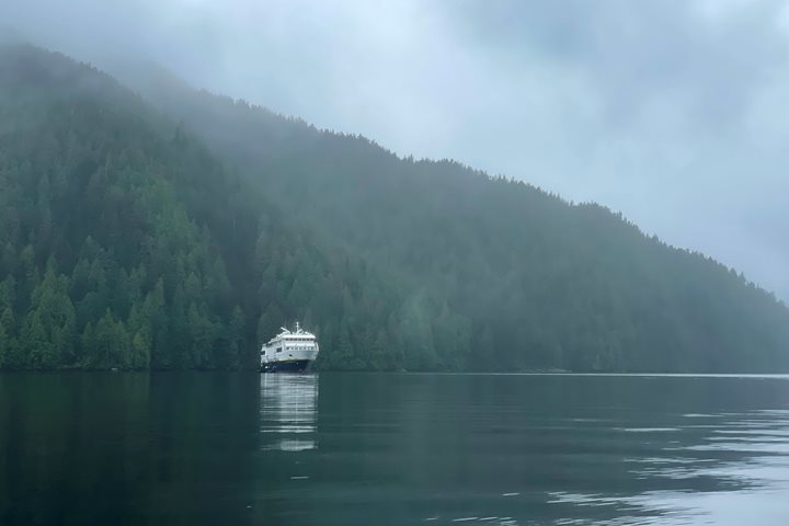 On this, the final day of our expedition, we awoke to the sound of rain in Lowe Inlet Marine Provincial Park. After several days of attempting to make our way to Lowe, only to get thwarted by whales, killer whales, bears, and other wildlife, we finally arrived today. The rainforest greeted us with the full rain shower service we have come to love and expect, and we greeted the rainforest first thing in the morning with the option to either hike or cruise through this lovely place. Intrepid hikers made their way from the inside of the back bay of Lowe through the home of the Great Bear and into the muskeg typical of this landscape, which used to be covered in glaciers. Those of us who explored by water were treated to a close-up view of Vierney Falls. We also explored the back bay where salmon swam, herons hunted, eagles perched above us, and kingfishers dipped about. Early on, our Zodiacs spotted yet another black bear, who greeted us before wandering back into its forested home. This trip has been so full of bears that we are struggling to keep count. After our cruises, we loaded back onto the vessel and turned due north to our final destination of Prince Rupert, our first stop where we began so many days ago. Our journey here was unexpected in every way. It was so full of life and memories that we will carry with us as long as we tell the story of where, how, and who. Where these animals live, how they need this forest to survive, who the people that live here are, and how they continue to fight for this land after calling it their home for thousands of years.