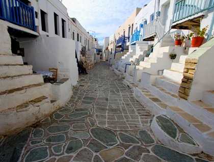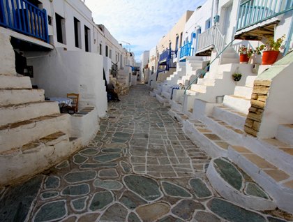 Next to Santorini, the small rocky island of Folegandros, our afternoon destination, has the most precipitous cliffs. The island covers just 31 square miles and has a permanent population of a little more than 700 people. Like all the Cycladic islands, the main town or Chora, is tucked up on the high rocky slopes away from the prying eyes of the pirates of yesteryear. This is one of the most stunningly beautiful and authentic of the Greek islands—one comes here to soak up the essence and pace of true village life. The outer walls of the houses in the center of the Chora form the walls of the late Medieval Venetian kastro. The tiny front terraces and doors face inwards and line the central street or plaza thus facilitating the village ladies sitting together cooking, sewing, or just having a good gossip! We followed our guides through the labyrinth of tiny passageways, past flower bedecked terraces, somnolent cats, and brightly painted doors with matching shutters. The more energetic members of group started their visit to the town with a hike up a steep switchback path to the whitewashed church of Koimisis tis Theotokou (Dominion of the Mother of God) while the rest of us visited the Church of the Virgin Mary in the kastro. As this was the first opportunity for many of us to visit an Orthodox church, we got a brief introduction of the Orthodox faith. At the end or our short walking tour we all had an opportunity to get lost in the maze of small streets and squares with our cameras or find a café to sample a Greek coffee or frappe, FIX beer, or a shot of Rakomelo, a local honey liqueur. We returned to the ship just as the sun was setting and the full harvest moon was rising.