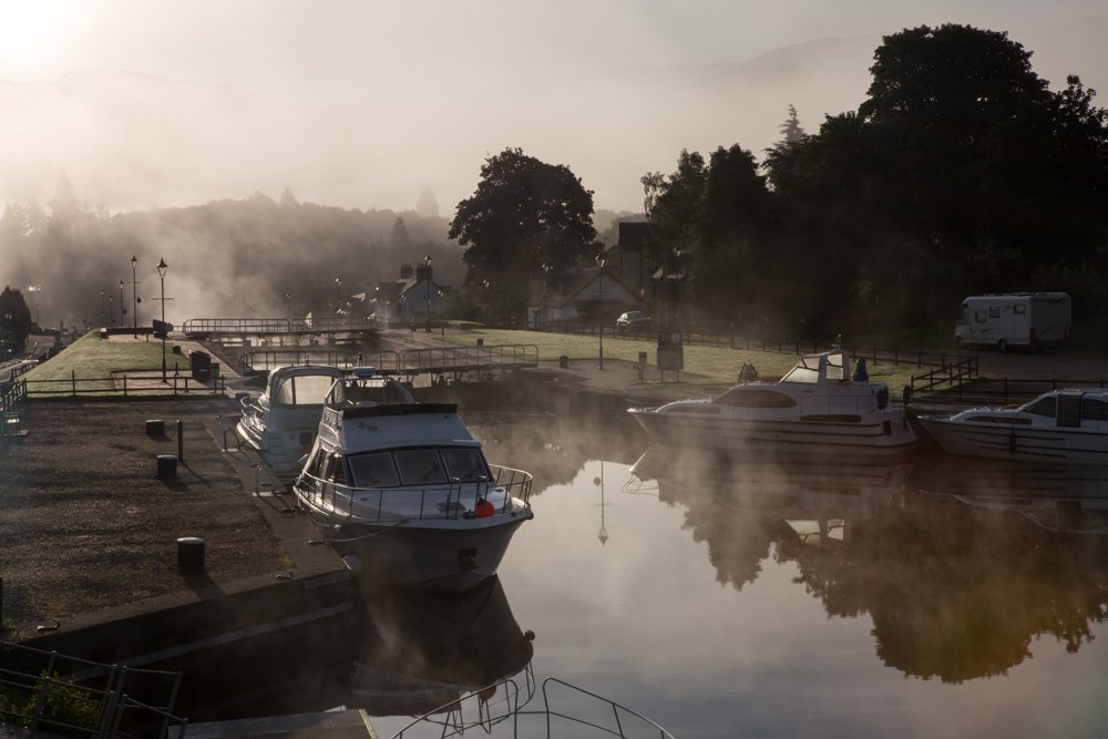 Early morning, we continued our ascent of the Caledonian Canal, with a slight delay just outside of Fort Augustus. A branch broken off by high winds earlier in the week lodged in a lock, stopping the gate from closing. We watched as the lock keepers used a grapple to remove the branch, then continued on our way, climbing up to the Canal’s high point of 106 feet at Loch Oich, before descending to our destination at Banavie, near the city of Fort William. On the way we passed through Moy Bridge, the last hand-cranked lock on the canal, and sailed through Laggan Avenue, a beautiful tree-lined stretch of the Canal.
