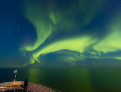 The northern lights brightened the sky last night/early morning as we left Hall Beach on the Melville Peninsula, and brought us into Wednesday in style. A pale ribbon of light intensified as we watched, with green swirls and columns filling the skies above the bow, rewarding those who had stayed up on deck shivering.