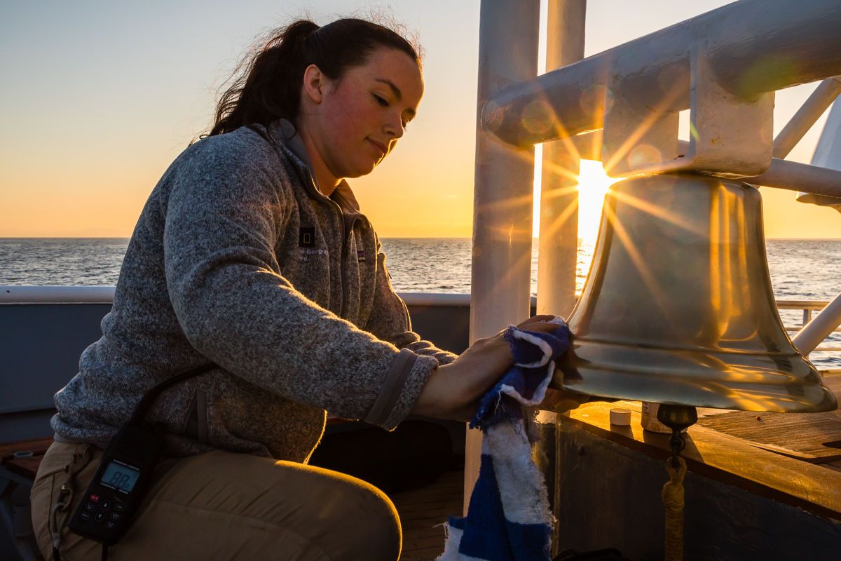 After days of sunshine and warm temperatures, the “raincoast” delivered some authentic fall weather today. The day started with a thick fog as we cruised into Friday Harbor and cleared Customs. By the time we reached Lime Kiln Lighthouse on the west side of San Juan Island, the fog had lifted, giving us picturesque views of the Strait of Juan de Fuca with Vancouver Island silhouetted along the horizon. We were able to tour the gorgeous lighthouse that, in addition to still being operational, serves as an interpretive spot for the southern resident orca whales that frequent the area. In recent years, this unique population of whales has shrunk to 73 individuals due to a variety of reasons, especially decreased salmon populations. In the evening, two members of the Center for Whale Research came aboard to discuss their most recent findings and what must be done to ensure that these intelligent and charismatic animals continue to populate these waters for generations. The San Juan Islands are also home to a little-known piece of U.S./U.K. history. Known as the Pig War, a nonviolent confrontation over the border took place between the two countries. It was settled after much dispute. For twelve years, American and British camps occupied opposite sides of the island until an arbitrator ruled in favor of the Americans, and the border was drawn in Haro Strait, west of San Juan Island. The sites of the two camps are now national parks, and the eerie fog that drifted up the treeless hills added to the overall environment, reminding us that, despite the dry weather, fall and Halloween are right around the corner.
