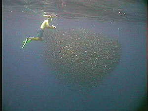 After a long cruise over the choppy seas back out to the channel entrance, we began to quarter back and forth across the waves, searching for the object of our intended rescue. At first our hearts sank when we could find no sign of it; for some time we drove the boats round and round without success, dismayed by the huge expanse of water we were attempting to search. Then Magnus Forsberg, driving one of the Zodiacs, detected a strong current running to the southeast. He radioed our boat and we set out in that direction and soon encountered a patch of numerous bits and pieces of flotsam. Moments later, Dennis Cornejo spotted the turtle! It was a giant leatherback, tightly entangled in a large piece of drift net with mono-filament mesh, quarter inch nylon line and several floats. Approaching this impressive animal from behind and taking great care of its jaws and powerful fore-flippers, Dennis and I secured the Zodiac's bowline to the net and then began to cut the net with our dive knives.