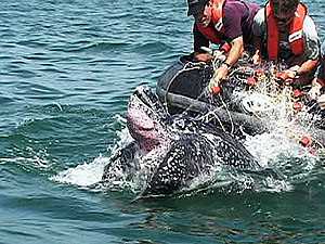 At first it seemed almost a hopeless task, there were at least three layers of net wrapped tightly around the turtle's shell and bunched around its head and flippers. But the serrated edges of our knives, made for just this kind of task, cut easily through the mono-filament and the nylon line and soon we were making visible progress. We had to pause occasionally when the great animal, which probably weighed 700-800 pounds, struggled against its bonds, thrashing the water with its three-foot-long flippers. Even though it was clear that the turtle had been in the net for some time, it was still strong enough to tow our Zodiac on a Nantucket sleigh ride! Whenever we could we continued to cut and soon only a few strands still held the net around it. I worked my fingers under the last tight threads looped over its neck and sliced through them; at the same time Trey Byus cut loose a thick bunch from the hind flippers. Suddenly the turtle surged forward and was free, swimming strongly away from us and diving steeply with strong sweeps of its fore-flippers! We all whooped and shouted with joy! Working as a naturalist and undersea specialist for Lindblad Expeditions I have a great privilege of close contact with amazing wildlife all over the world; it felt wonderful to render a small amount of aid to one of the wild creatures I enjoy so much.