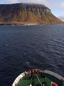Early in the morning the ship started moving from the quiet anchorage where we had spent all of yesterday and much of the polar night. A few people were awake as the magnificent scenery of Rabini Rock back-dropped with fog pouring over ice cap glacier passed off the stern. Ahead was more fog and we soon were engulfed again. However the day eventually brightened as we moved to one of the very southern most points of land in the archipelago, Cape Flora on Northbrook Island. As we came around the corner of the island there was a strong easterly wind blowing away the fog but producing sloppy waves on the exposed shoreline.
