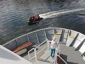Actually, from the distance in this picture, I can't tell if these are hikers or kayakers. I took the photo while perched on top of the wheelhouse. Anyway, today while I was standing my morning watch, some of the guests walked up to Lake Eva from the trailhead which starts in the treeline just above highwater, and some chose to spend the morning kayaking along the shoreline here in Hanus Bay. If you could look a little more closely at the people in the Zodiac, those with wet sleeves would be identified as the kayakers, and those with muddy boots, the hikers. They all met back together on the beach for these shuttles to the ship, just in time for lunch. If you believe stories, theirs were about bears, harbor seals, eagles, moss thick enough to swallow a person hole, running salmon and so on and so forth.