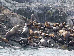 Several cruisers witnessed an amazing display of a male sea lion feeding just in front of the Zodiac. Fish are trapped in the converging waters, becoming easy prey for hungry predators, such as the sea lions. This particular sea lion repeatedly tossed a very large silver salmon at the surface, seeming to tease the gulls hovering in mid-air above. After one last glimpse of the doomed salmon, the sea lion gulped the fish, and dove below the surface.