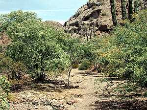 Biological diversity abounds here. Insects buzz into flowers busily collecting nectar and pollen. Flycatchers, gnatcatchers, warblers, and shrikes flit busily after their hapless prey. Lizards scamper and dart out of harm's way. Plant communities thrive here as well. These emerald pathways are a magnet for desert life.