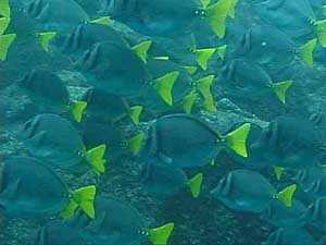 This morning, “Finisterra,” or “Land’s End” at Cabo San Lucas was off the port side as we rounded the sunrise-lit beige, creamy, tannish rocks. This place was favored by British pirates or privateers between the years of 1585 to 1815, being the mandatory route of the Manila Galleons. These ships brought riches to the New Spain’s port of Acapulco from the Philippines. The last of the Manila Galleons sailed off Acapulco in 1815 after the independence of Mexico and the Napoleonic invasion in Europe, and thus pirates became history in Baja California Sur. We paused long enough for fine views of the rocks, sea lions and the birds before heading to the marina in Cabo. The docking intention was interrupted when someone spotted a breaching humpback whale. There were only one or two jumps from the adult and then the baby whale started breaching and kept us captivated for 15 minutes. Yes, on Lindblad expeditions, we do “stop for whales” and that is why our daily schedule is called the daily intention. As everyday, options were presented. Most of the guests opted for snorkeling at “Friar’s Rock.” Here the visibility of the water was crystal clear, and the marine life was exuberant. One of the many examples of the fish we saw was the group of yellowtail surgeonfish shown in the picture. Mike Greenfelder, our undersea specialist, encountered Moorish idols, guineafowl puffers and even a white-tipped shark! Meanwhile, a few of us went on a pleasant and very productive bird walk, seeing 20 different species including the endemic gray thrasher and the more common, but equally interesting, pyrrhuloxia and Costa’s hummingbirds.