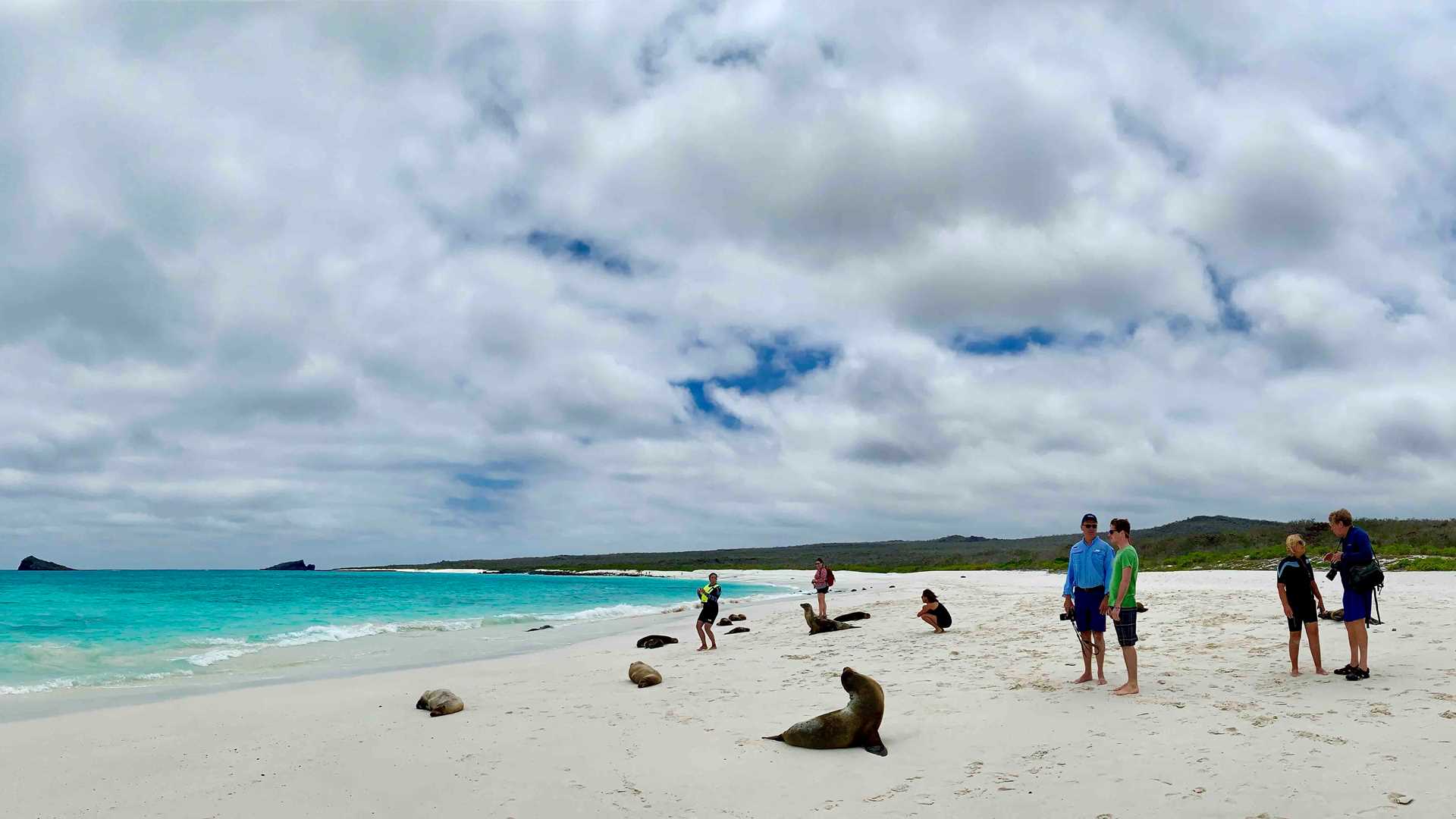 On National Geographic Endeavour II today, we explored Bartolome, home of a small colony of Galapagos penguins. Bartolome is one of the youngest islands, and it is located next to Santiago Island in the central part of the archipelago. After an amazing sunrise, we went ashore for a walk, and we were transported back to a time when the land was newly formed. We began our day by hiking to the top of a tuff cone known as the islet of Bartolome, named after the First Officer of The Beagle . Walking on this young island allowed us to understand the formation and volcanism of the Galapagos Islands. The rocks are a great way to understand the area and its geology. We spotted a few lava lizards and painted locusts, some of the very few animals on this island. As we reached the top, we had a great view. Our guests enjoyed the magnificence of Pinnacle Rock. After we visited one of the most iconic geological formations of the Galapagos, our breakfast was enhanced by dramatic views of the impressive volcanic landscape. We visited the beach near Pinnacle Rock, where we enjoyed how the sun made the sand sparkle due to a concentration of silica. Later, we went snorkeling along the channel between Santiago and Bartolome Islands. Many of our guests spotted whitetip reef sharks and very colorful parrotfish. The landscape was beautiful with lots of sea stars. We enjoyed the chance to be surrounded by Galapagos penguins and feel accepted as part of this environment. After a delicious Mexican lunch, we had lectures on the photography of reptiles and Darwin. Afterwards, we went to Chinese Hat Islet to snorkel from the Zodiacs. The area is home to a small colony of Galapagos penguins. In a sandy-bottomed, sheltered channel, our guests enjoyed swimming with whitetip reef sharks, rays, and many fish. It was a nice and sunny afternoon. After snorkeling, we had the chance to explore the unique, small volcano that formed an island in front of Santiago on a sunset Zodiac ride. After a spectacular day full of activities in the field, we returned on board. Every day in the Galapagos is an opportunity to reconnect with the beauty of nature through unbelievable encounters!