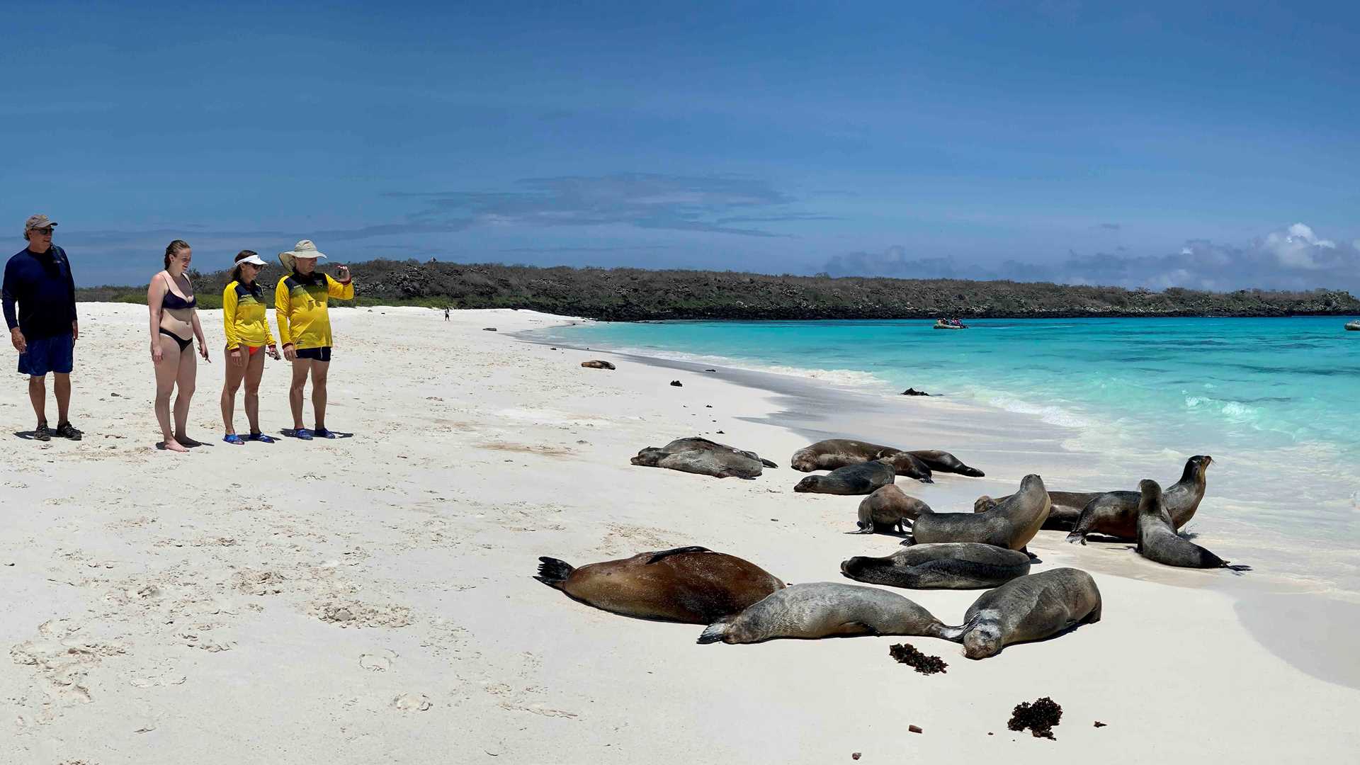 On National Geographic Endeavour II today, we explored Bartolome, home of a small colony of Galapagos penguins. Bartolome is one of the youngest islands, and it is located next to Santiago Island in the central part of the archipelago. After an amazing sunrise, we went ashore for a walk, and we were transported back to a time when the land was newly formed. We began our day by hiking to the top of a tuff cone known as the islet of Bartolome, named after the First Officer of The Beagle . Walking on this young island allowed us to understand the formation and volcanism of the Galapagos Islands. The rocks are a great way to understand the area and its geology. We spotted a few lava lizards and painted locusts, some of the very few animals on this island. As we reached the top, we had a great view. Our guests enjoyed the magnificence of Pinnacle Rock. After we visited one of the most iconic geological formations of the Galapagos, our breakfast was enhanced by dramatic views of the impressive volcanic landscape. We visited the beach near Pinnacle Rock, where we enjoyed how the sun made the sand sparkle due to a concentration of silica. Later, we went snorkeling along the channel between Santiago and Bartolome Islands. Many of our guests spotted whitetip reef sharks and very colorful parrotfish. The landscape was beautiful with lots of sea stars. We enjoyed the chance to be surrounded by Galapagos penguins and feel accepted as part of this environment. After a delicious Mexican lunch, we had lectures on the photography of reptiles and Darwin. Afterwards, we went to Chinese Hat Islet to snorkel from the Zodiacs. The area is home to a small colony of Galapagos penguins. In a sandy-bottomed, sheltered channel, our guests enjoyed swimming with whitetip reef sharks, rays, and many fish. It was a nice and sunny afternoon. After snorkeling, we had the chance to explore the unique, small volcano that formed an island in front of Santiago on a sunset Zodiac ride. After a spectacular day full of activities in the field, we returned on board. Every day in the Galapagos is an opportunity to reconnect with the beauty of nature through unbelievable encounters!