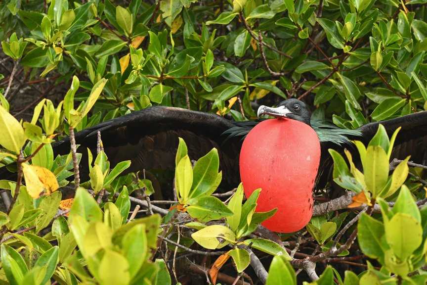 The white coralline beach and the red mangroves of Genovesa are the nesting grounds for red-footed boobies. We were lucky to spot several minor frigatebird males with their red pouches inflated, which gave us a chance to talk about their mating ritual and courting behavior, probably one of the most interesting routines among sea birds. Although most frigates have paired up at this point, some bachelors are still displaying their half-inflated pouches in a half-hearted attempt to attract females that don’t seem to be particularly interested in them.