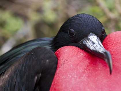 Later in the morning, we landed on the island to explore the shore with its colonies of great frigatebirds, Nazca boobies, red-footed boobies, and yellow-crowned night herons. From the moment we reached the shore, we were surrounded by sea birds, some on land and some in the air. A few yards from shore, we spotted the first frigatebirds with their pouches inflated. It was breathtaking to see these large birds with their red pouches on the green bushes.