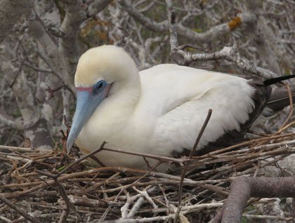 Of course the highlights of our morning and afternoon shore visits were the fabulous boobies of Genovesa Island: Nazca and red-footed boobies were nesting everywhere. Nazca boobies with their stark white and black plumage are elegant (and noisy). The red-footed boobies have incredible face colors that amaze more than their feet. However a few great frigatebird males were still courting: red pouches inflated, bills clicking, warbling their intentions to be good mates to any female still available and interested.