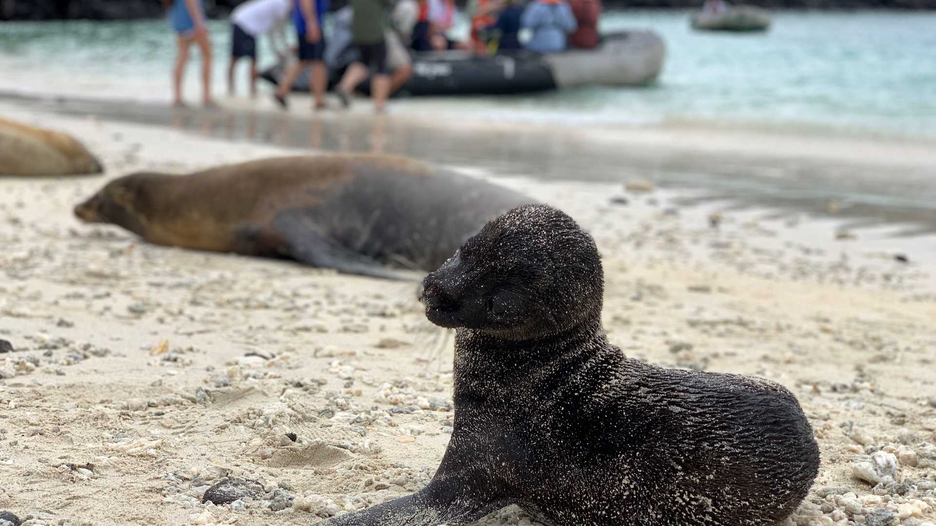 On National Geographic Endeavour II today, we explored Bartolome, home of a small colony of Galapagos penguins. Bartolome is one of the youngest islands, and it is located next to Santiago Island in the central part of the archipelago. After an amazing sunrise, we went ashore for a walk, and we were transported back to a time when the land was newly formed. We began our day by hiking to the top of a tuff cone known as the islet of Bartolome, named after the First Officer of The Beagle . Walking on this young island allowed us to understand the formation and volcanism of the Galapagos Islands. The rocks are a great way to understand the area and its geology. We spotted a few lava lizards and painted locusts, some of the very few animals on this island. As we reached the top, we had a great view. Our guests enjoyed the magnificence of Pinnacle Rock. After we visited one of the most iconic geological formations of the Galapagos, our breakfast was enhanced by dramatic views of the impressive volcanic landscape. We visited the beach near Pinnacle Rock, where we enjoyed how the sun made the sand sparkle due to a concentration of silica. Later, we went snorkeling along the channel between Santiago and Bartolome Islands. Many of our guests spotted whitetip reef sharks and very colorful parrotfish. The landscape was beautiful with lots of sea stars. We enjoyed the chance to be surrounded by Galapagos penguins and feel accepted as part of this environment. After a delicious Mexican lunch, we had lectures on the photography of reptiles and Darwin. Afterwards, we went to Chinese Hat Islet to snorkel from the Zodiacs. The area is home to a small colony of Galapagos penguins. In a sandy-bottomed, sheltered channel, our guests enjoyed swimming with whitetip reef sharks, rays, and many fish. It was a nice and sunny afternoon. After snorkeling, we had the chance to explore the unique, small volcano that formed an island in front of Santiago on a sunset Zodiac ride. After a spectacular day full of activities in the field, we returned on board. Every day in the Galapagos is an opportunity to reconnect with the beauty of nature through unbelievable encounters!