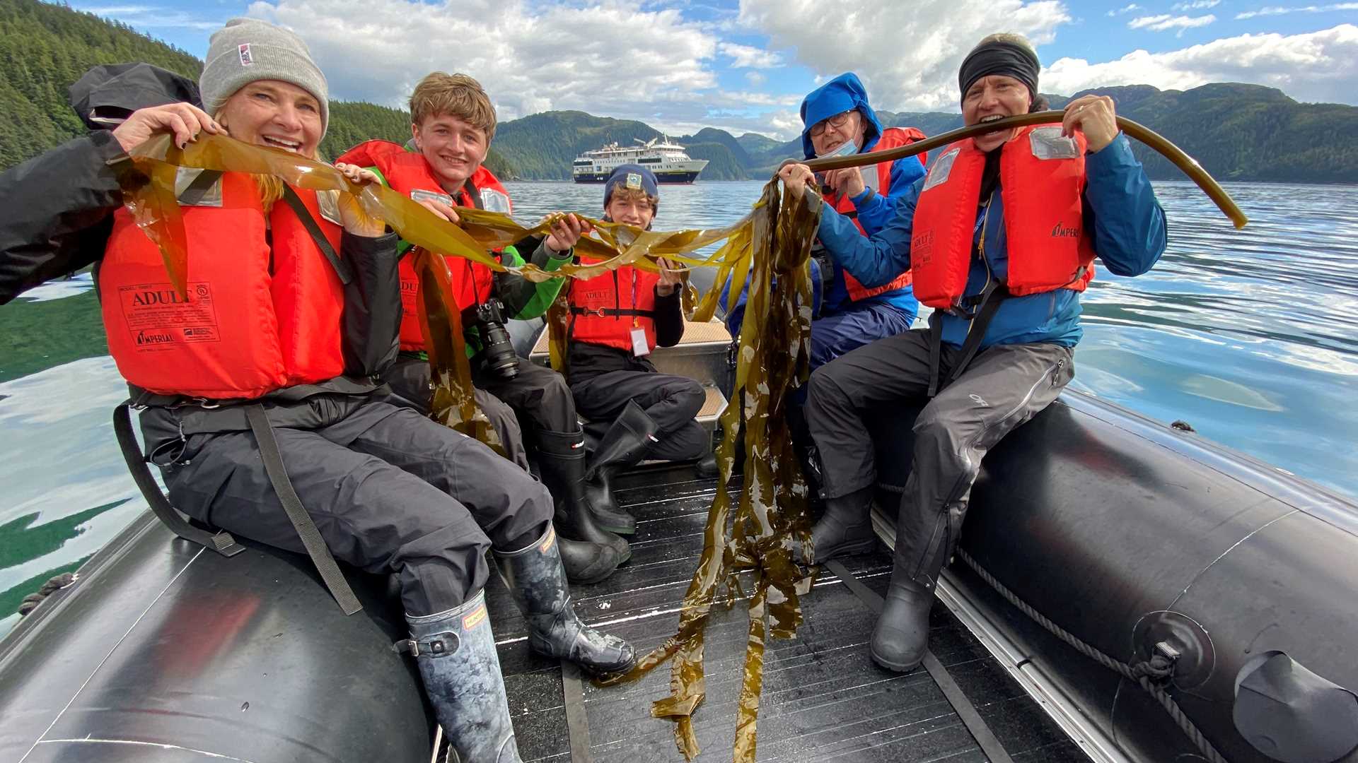 While we enjoyed a warming lunch back onboard, the ship repositioned a short way east to the glorious Inian Islands. Nutrients brought in by the strong tides created by the Pacific Ocean squeeze into Icy Strait and fuel a complex and incredibly rich ecosystem here. So, bellies full, and with the weather continuing to smile on us, we headed out in the Zodiacs to explore. Apparently, we weren’t the only ones enjoying full bellies—dozens of Steller sea lions, otters, oyster catchers, glaucous-winged gulls, and pigeon guillemots were relaxing in the sun or playing in the water. The clouds even lifted enough to give us a stunning view of the rugged, ice-covered Fairweather Range and Brady Glacier. The cherry on top was finding a tufted puffin floating on the glassy waters as we headed back to the ship to relax.