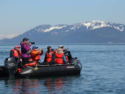 Meanwhile, others kayaked in the interesting bay, where birds were seen in caves. And even others preferred to be taken in expedition landing craft around the island, enjoying its broken rock character.
