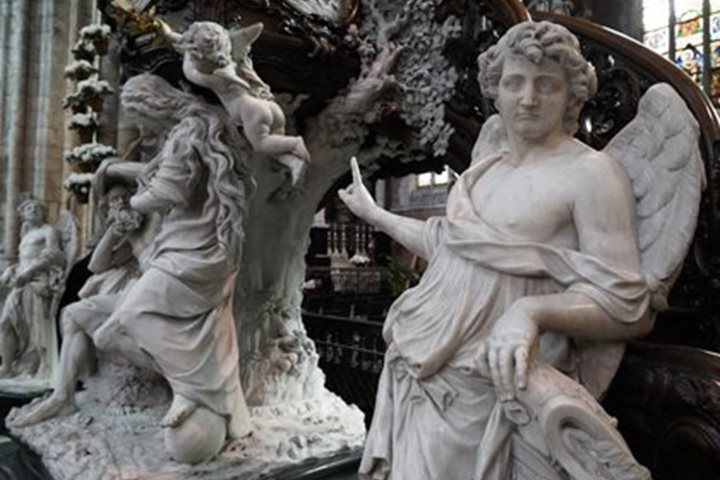 Saint Bavo’s Cathedral, originating in the 10th century, is another of Ghent’s many famous buildings. Along with being able to enjoy the church itself, we were also extremely fortunate to get a viewing of Jan Van Eyck’s early 15th -century work, “The Adoration of the Mystic Lamb.” Housed in a quiet, dedicated space so it can be contemplated in peace, this masterpiece is a truly astonishing display of the artist’s technical prowess and fine sense of aesthetic. Many other works of fine art filled the building, and we enjoyed them against a backdrop of haunting harp music from a local harpist who was a regular in one of the smaller chapels.