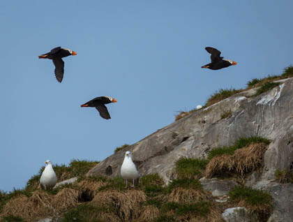 As we began our journey "up the bay," we had excellent views of the mighty Fairweather Mountain Range rising into the sky to the northwest, brilliantly covered in thick winter snow. Sea otters bobbed in the water along the way. We headed first to South Marble Island where we found hundreds of Steller sea lions, and throngs of seabirds. There were many black-legged kittiwakes, glaucous-winged gulls as well pigeon guillemots. A favorite attraction was undoubtedly the numerous, colorful tufted puffins that were seen swimming, perching, and flying around this small and bustling seabird rookery.