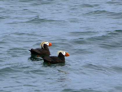 Our first stop was at South Marble Island, a site of breeding seabirds: tufted puffins, common murres, black oystercatchers, kittiwakes, and glaucous-winged gulls that once provided fresh eggs each spring for the Tlingit people. Numerous Steller's sea lions lounged in heaps on the rocks, uttering their belching roars.