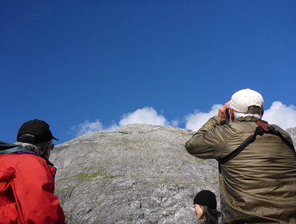 We were delighted to have William aboard for the day, for witnessing the parade of wildlife. It was easy for us all to feel the spiritual nature of Glacier Bay. It started with South Marble Island, where hundreds of Steller sea lions postured and growled, and seabirds perched on every inch of rock that was shy of vertical. Gloomy Knob, though earning its name with tendrils of fog across its face, was clear enough for the group to spot mountain goats foraging on the steep granite, far from predators in the safety of the mountains. Or so we thought, until, circling around the far side of Gloomy, we encountered a mother brown bear traversing the cliffs with her three cubs-of-the-year. Murmurs came from the gathered crowd on-deck: “So steep!” “That’s quite a climb to find some berries.” “She deserves a standing ovation if she gets all three of those cubs to the top!”