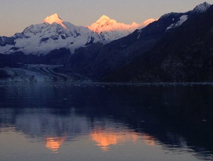 We woke up all the way up Johns Hopkins Inlet. The alpenglow painted the snowy tops of the mountains in pink, and the forest in pastel colors. The mirror-like water doubled up the beauty with the perfectly reflected image on its surface. This was just the beginning to a day full of scenic highlights, traveling through the footprints of glaciers from the past.