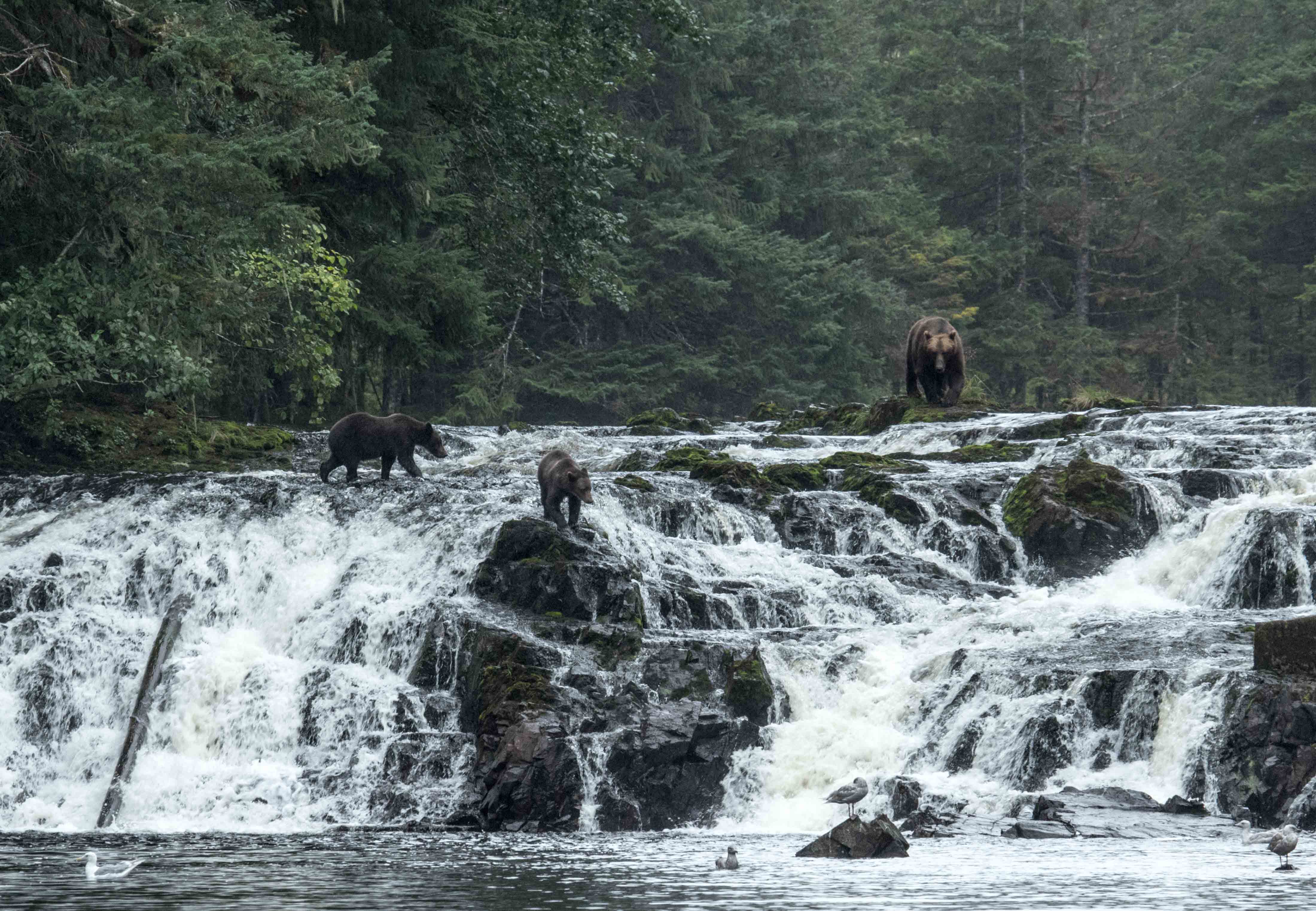 After a brief stop to enjoy the rich color of the glacier fondly referred to as “Lamplugh the Blue,” we continued southward. Park Ranger Jenny Eberlein and Tlingit cultural interpreter Leona Santiago discussed the natural and cultural history of the park with guests in the lounge over cocoa while our naturalists scanned the surrounds for wildlife. High on the dolomite cliffs of an outcrop known as Gloomy Knob, amongst the swirling mist we spotted a mountain goat grazing on the sparse vegetation. Shortly thereafter along the beach we came upon a brown bear sow and her three cubs turning over intertidal boulders to feast on crabs and other invertebrates. As we watched the four made their way to a nearby creek and the mother suddenly dashed into the water, grabbed a salmon and shared it with her cubs.