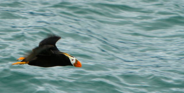 After lunch we approached South Marble to find a bonanza of marine life. Resembling flying penguins, common murres dove into the rich water surrounding the island while tufted and crested puffins wheeled overhead. As we came alongside the island a humpback whale surfaced near the ship before veering away in search of food. The croaking groans of the many Steller’s sea lions hauled out on the rock trailed after us as we pulled away. In the evening we fanned out to explore the forests surrounding the ranger station at Bartlett Cove and drew the day to a close with a delicious dinner and fascinating presentation by local writer, musician, and storyteller Kim Heacox.