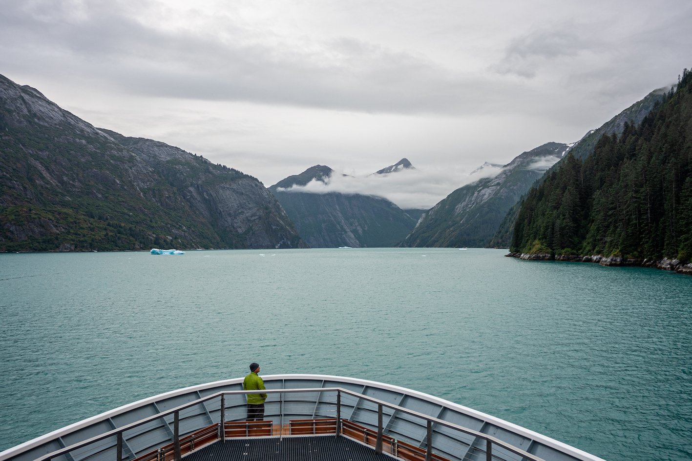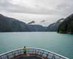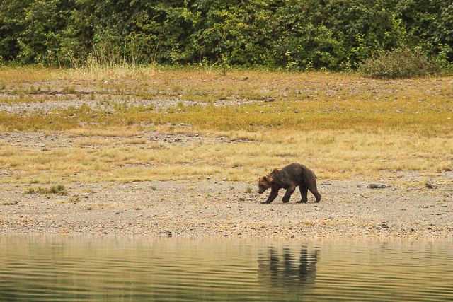 National Geographic Venture continued her journey north toward the end of the bay and entered the protected Tidal Inlet where we were able to get a very good view of a big male brown bear. A little while later, we spotted some more brown bears walking along the beach, and a sow with her two cubs. We watched them as they climbed a steep cliff and marveled at the ease and confidence of their movements. Not long after, we discovered a number of mountain goats resting and grazing the steel-gray rock faces of Gloomy Knob, followed by the discovery of a solitary male killer whale patrolling the waters of the bay. What a privilege to being able to admire such magnificent animals in the wild!