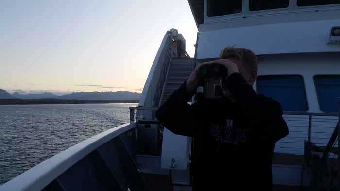What is a day in the life of a Global Explorer in Alaska like? If it’s a sunshiny day in Glacier Bay National Park, it starts early! While the sun is still rising, we pick up a special guest in Bartlett Cove: a National Park Service Ranger! On the bow in a brisk dawn, we begin a journey Up Bay, on the lookout for wildlife and fun. The day has yet to behold the wonders of pristine wilderness: rainforest, glacial fjords, mountain goats, brown bears, harbor seals, tidewater glaciers, and the joy of experiencing all with family and friends.