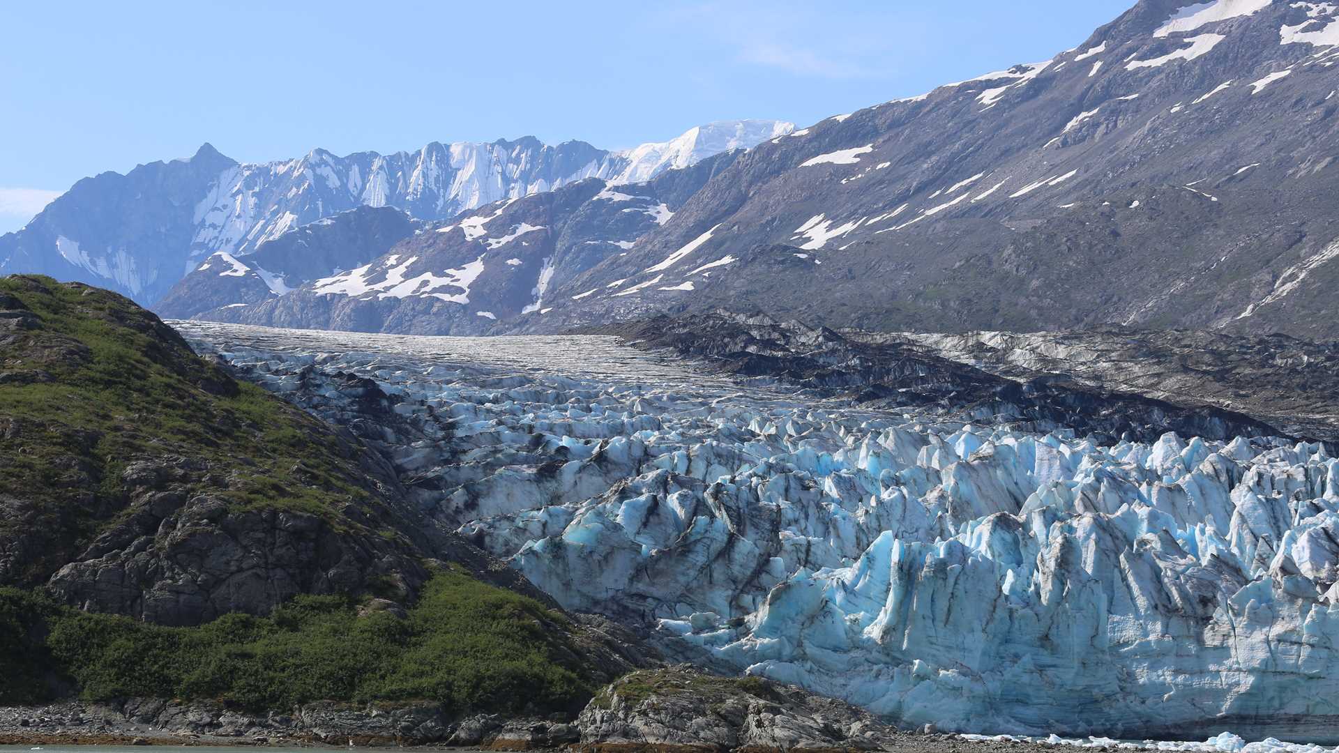 Glacier Bay National Park provided guests aboard National Geographic Venture with stunning views of her glaciers, mountains, marine life, and rocky landforms. Today dawned foggy and overcast as we sailed northward up Glacier Bay from Icy Strait. The fog gradually lifted, and the clouds spread open to reveal stunning views of upper Tarr Inlet as we sailed past Reid and Lamplugh Glaciers on our way to Margerie Glacier and, eventually, the debris-covered terminus of Grand Pacific Glacier – one of the main “trunk” glaciers that once filled all of Glacier Bay. Several sea otters occupied a small iceberg as we approached Margerie Glacier, and they suddenly decided to take a swim as National Geographic Venture drifted past. Margerie Glacier, a classic tidewater glacier, was highly active in the bright morning sunshine with her usual loud cracks and booms, signaling the movement of ice. Guests on board National Geographic Venture were rewarded with several spectacular calving events as large blocks of ice fell off the front of Margerie Glacier into Tarr Inlet. As the ship prepared to leave, an enormous mass of ice calved off the center-left side of Margerie, creating an enormous wave that washed over icebergs floating in front of the glacier.